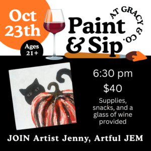 Paint on a wood panel with Jenny of Artful JEM. All supplies, snacks, and a glass of wine is provided. Ages 21+ Register by October 21st. *Attn: Cancelations must be made 24 hours in advance of the date of event to receive a full refund.